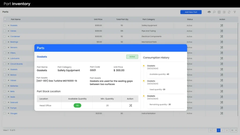 Manage the assets and its associated parts in the inbuilt inventory to track the utilization and its associated cost.